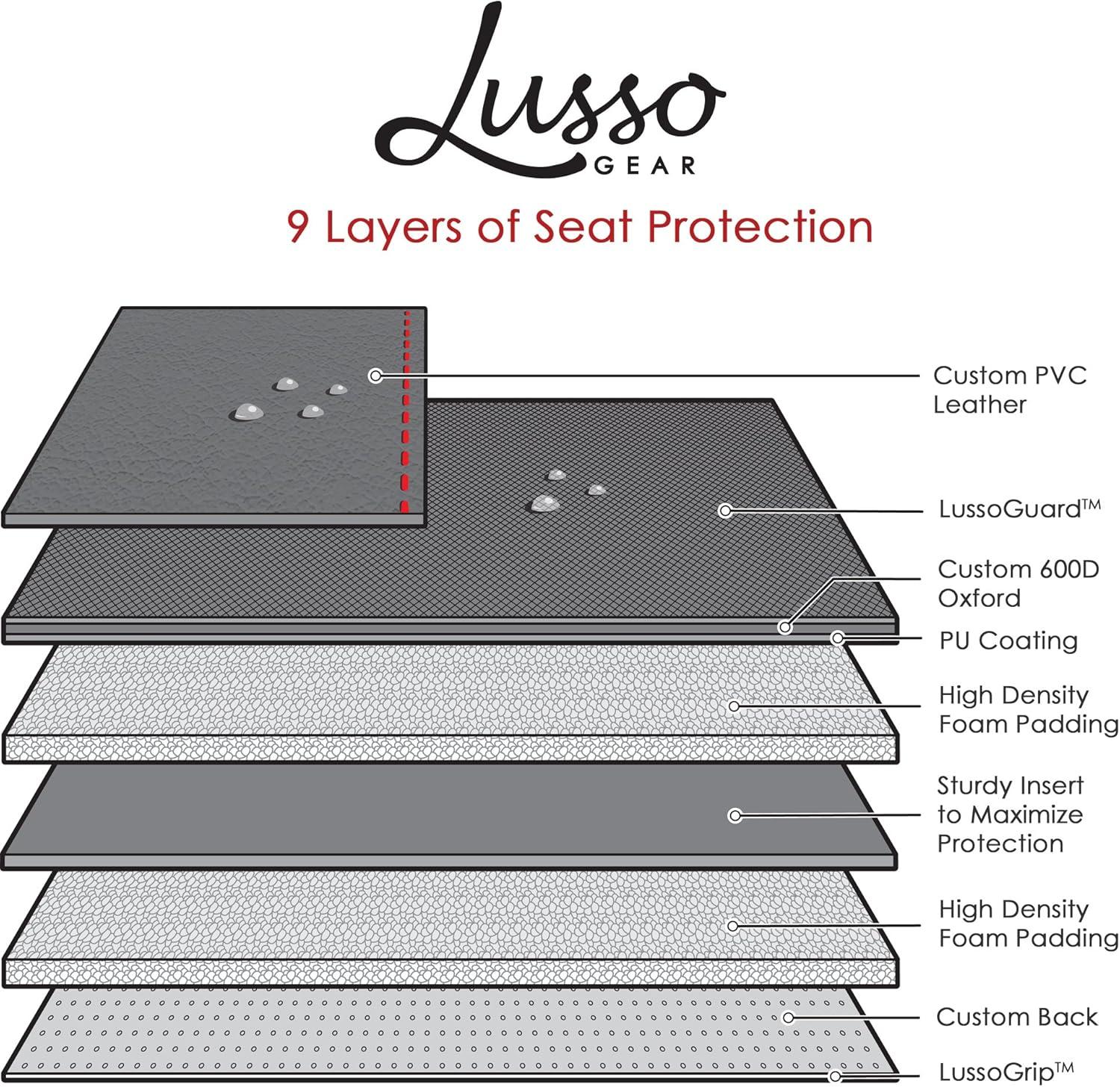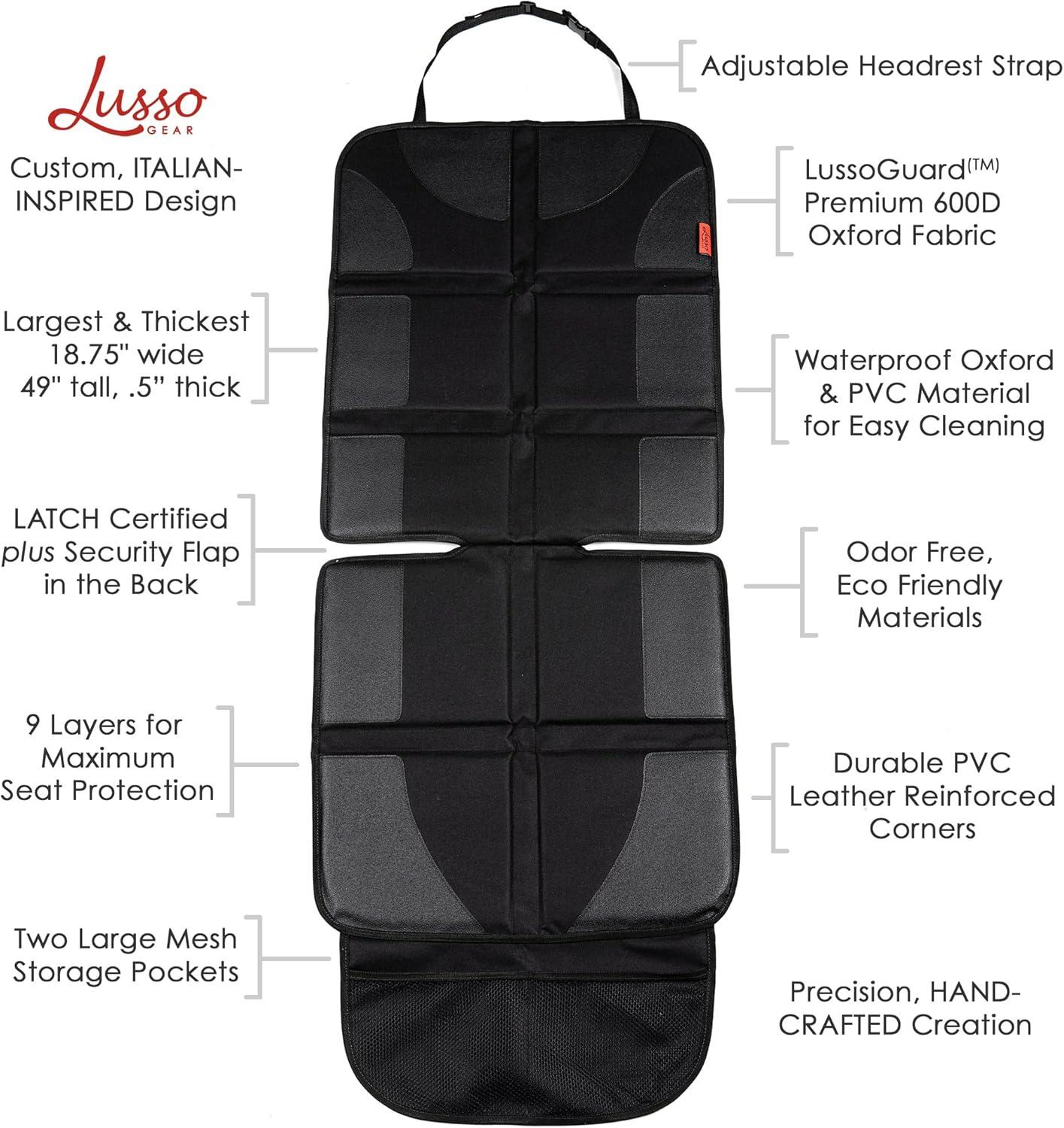 Elite Seat Saver: The Lusso Gear Car Seat Protector comfortably covers front and back car seats against wear and tear. This padded seat protector guards vehicle seats from infant booster imprints, as well as pet kick damage and drool stains.